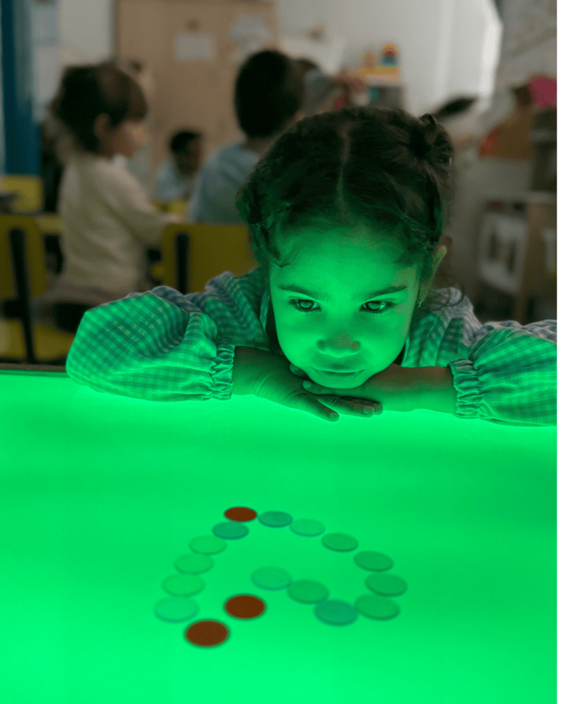 Al encender la mesa, el entorno se transforma. La luz actúa como un imán para la atención, permitiendo que los niños y niñas se sumerjan en un estado de observación profunda.